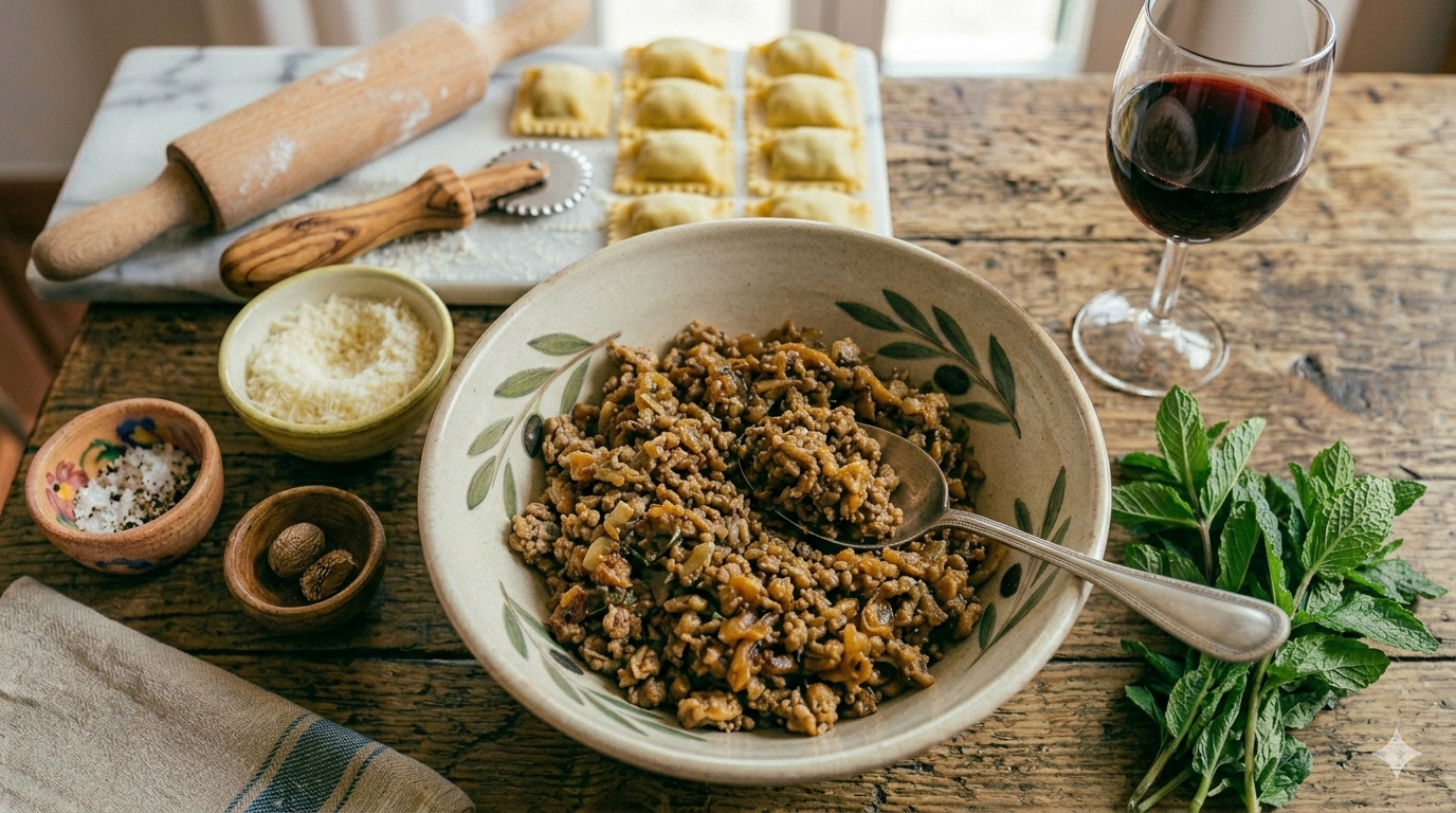Ripieno per plin: caldo e avvolgente, d’obbigo sorseggiare un calice di vino durante la preparazione.